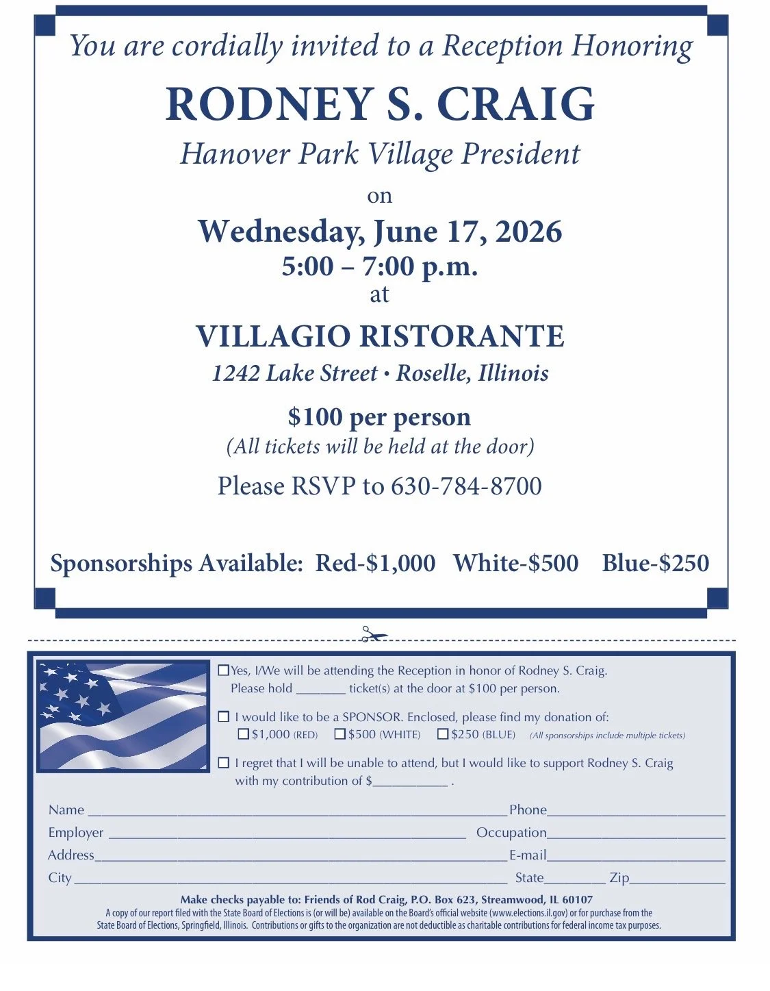 On June 17, 2026, please join Friends of Rodney S Craig for Village President at a reception honoring Rodney S. Craig.